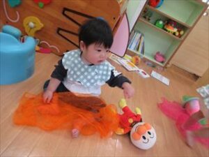 食後の自由あそびでは、スカーフで「いないいないばあ」を友だちや保育者と一緒に楽しみました。
