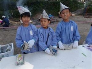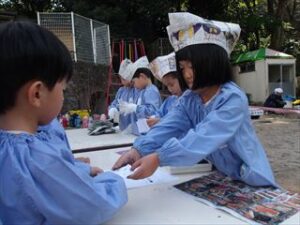 年長組の子どもたちは自分たちで作った帽子をかぶって、