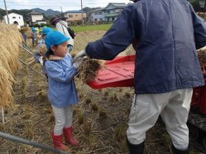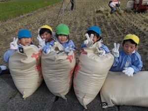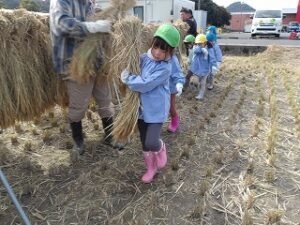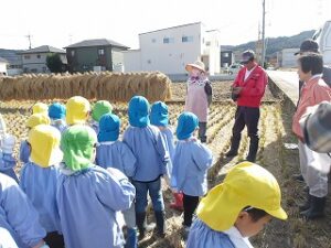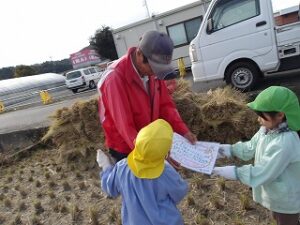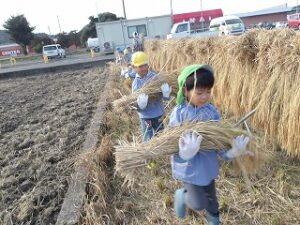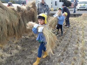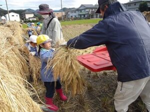 先日刈り取った稲がよく干されており、子どもたちからは「すごーい」