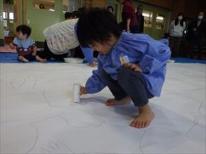 みんなの等身大をとった後は、いよいよ絵の具を使って遊びます!