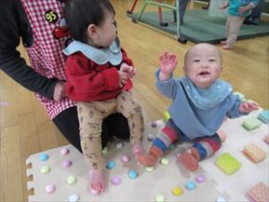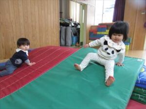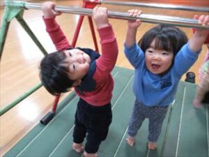最近は、外で遊べることが少ないので登園後はホールで思い切り身体を動かして遊んでいます!