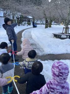 除雪機に遭遇!機械の中から雪がでてくるのをみて、「わーーー!」と興味津々のこどもたち。