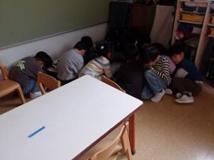 避難の合図があると子どもたちは、部屋の隅に固まって静かにする様子が見られました。