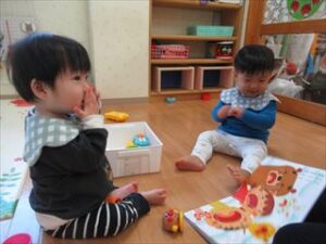 お気に入りの歌えほんを手にとり、歌詞に合わせて手をたたいたり、笑う仕草を真似たりと楽しい気持ちなどを表現できるようになってきています。