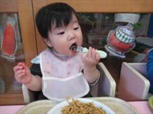 みんなの大好きな給食では、自分でフォークを持ち、やきそばをすくって口に運ぶ姿に成長を感じる瞬間です。